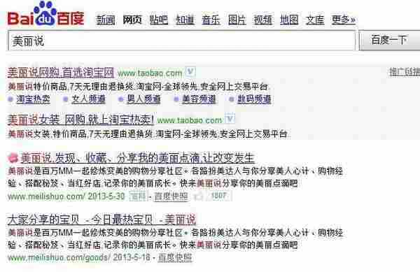 淘宝对美丽说、蘑菇街之类的导购网站态度已然明朗,近日在百度搜索美丽说、蘑菇街,第一条结果是淘宝网,没错,美丽说、蘑菇街的关键词被淘宝抢去了。