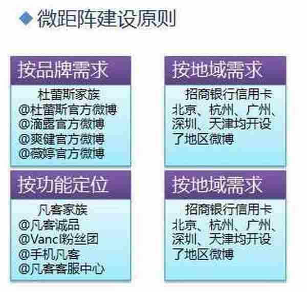 按品牌需求:如杜蕾斯家族的微博,就包括@杜蕾斯官方微博、@滴露官方微博、@爽健官方微博和@薇婷官方微博,因为是不同的品牌有不同的定位,所以需要分别建立微博。