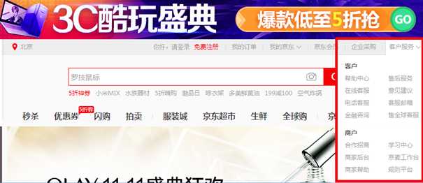 我们可以清楚的看到双11快来了,京东在首页顶端推送了广告,而右侧红框在客户服务部分弹出了相关的一些信息介绍,这里需要说明的是我不知道有多少PC端用户会关注这个部分,当然京东的平台体量大,可能并非重视这些小细节,这里对于中小型的电商网站,我们其实可以把重要的相关信息放到“登录”按钮框下,以便在用户登录的时候吸引更多的注意力。