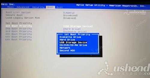 3.向右选择Boot,Secure Boot选择Disabled,Boot List Option选择Legacy,选择1st Boot Priority,选择USB Storage这项。如图所示:
