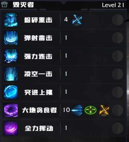 粉碎重击4点、弹射凿击1点、强力连击1点、凌空一击1点、大地贪食者1点、全力挥动4点