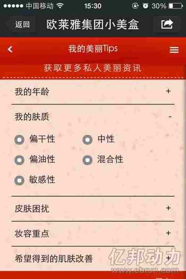 亿邦动力网了解到,欧莱雅小美盒有意借助微信私密特点强化“私人定制”特色。除了为用户定制化妆品,还通过定制“小美形象”与用户互动,鼓励用户上传本人照片并征集好友印象,欧莱雅再为幸运用户制作专属动漫形象。