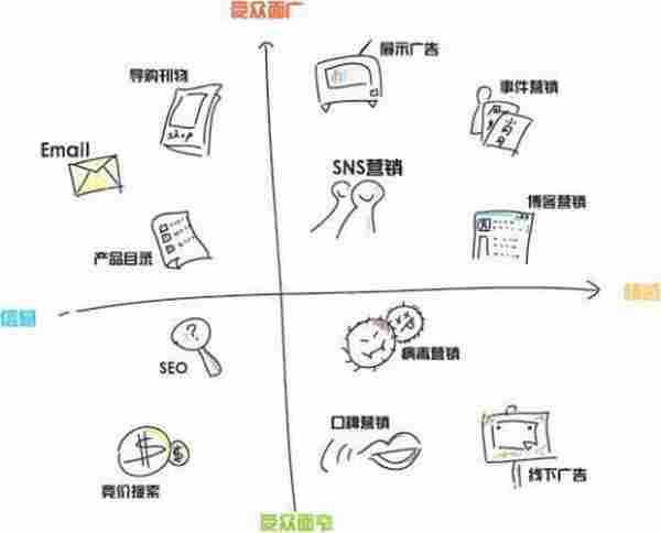 这里我们把现行最主流的互联网推广手段按照其受众多寡以及信息情感化程度进行比较,将其大致地放在以上的矩阵中。总的来说,右边的推广手段会比其左边的手段更偏重情感诉求,而越往下的推广手段越精准,覆盖面越小,其投放成本也应当相应降低。现实情况下,公司不可能仅仅使用其中一项推广手段进行营销活动。在注重整合营销(IMC)的当下,根据公司的战略定位选取合适的营销组合,才是合理利用营销资源的做法。