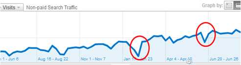 例如上面这个图中,显示的是Non-paid Search Traffic(非付费的搜索引擎流量)的周度趋势情况,从Google Analytics的Advanced Segments中你能够很容易的得到这个报告。图表中的趋势很明显,流量稳步上升,说明SEO的表现不错。不过,对于网站分析中的趋势分析,永远值得注意的是“outliers”,即例外情况。这个趋势中有几个明显的“缺口”,第一个缺口是因为春节,第二个缺口则并不是因为过节,而是其他原因造成的,研究造成这个缺口的原因,能够帮助我们进行更好的SEO。