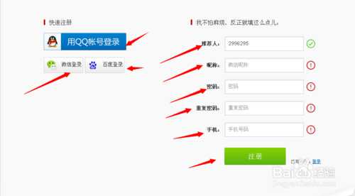 3、按步骤准确填写推荐人,2996295、,昵称、密码、手机号、最后点击注册 ;