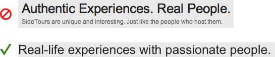 要描述你的网站其实可以有很多方式,但问题出在有些形容词真的太广泛了,谁都可以用,用这些形容词不会让你的网站特别有趣。不如使用更精準、独特的词描述你可以带给使用者什么好处。这能让读者对你能提供的东西有更清楚的印象,知道你的产品跟别人有什么不一样,进而想了解更多。