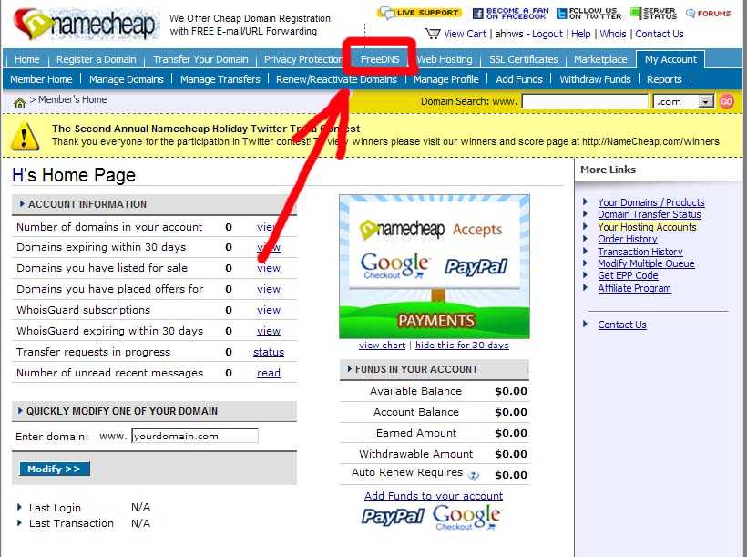 步骤1:打开www.namecheap.com,按图中箭头所指,首先注册一个帐户。