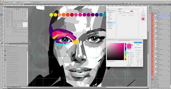 设置调色板可以帮助组织图示的颜色。对于我们的形象,我们想要一个整体的紫色,亮黄色和橙色的亮点。创建一个eclipse并将其颜色设置为明亮的黄色/绿色。复制并设置其余的颜色,如图所示。