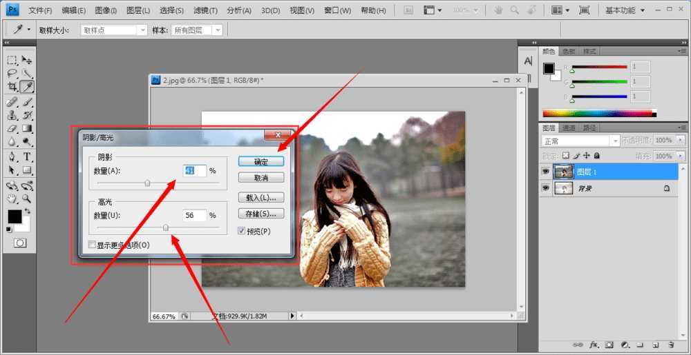 5、单击确定以后,照片上还有黑色斑块,需要处理一下,单击图像-调整-阴影和高光,在弹出的阴影和高光中,设置数值如图。