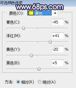 1、打开原图素材,创建可选颜色调整图层,对黄色,绿色进行调整,参数设置如图1,2,效果如图3。这一步把图片中的黄绿色转为橙黄色。