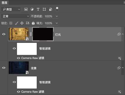 步骤 2:智能滤镜在图层面板中,单击"灯光"图层前的眼睛图标关闭图层,选择"夜景"图层作为调整对象。接下来,我们将要使用Camera Raw滤镜为该图层营造出需要的氛围。