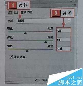 6、在“色彩平衡”调整面板的“色调”下拉列表框中,选择“阴影”选项,设置相应参数。