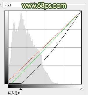 3、按Ctrl + Alt + 2 调出高光选区,按Ctrl + Shift + I 反选得到暗部选区,然后创建曲线调整图层,对RGB、红、绿通道进行调整,参数及效果如下图。这一步把图片暗部颜色加深,并增加红褐色。