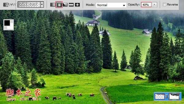 3、取消选区后添加蒙版,选择渐变工具颜色设置为黑白,不透明度为:40%,然后拉出径向渐变。这一步是把天空部分稍微变暗。