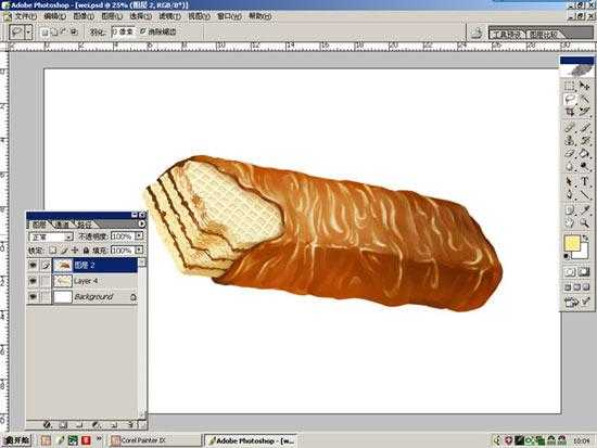 31.是不是看着缺点什么?太秃了点吧,好!我们再加上些溅飞的碎渣,对表现食品质感效果提神呦。回到photoshop中在威化层用自由套索工具拷贝几块威画到新的图层以便我们修改绘制。什么?为什么不重新画?拜托,时间紧任务重、客户直发疯你还有心情重新画?合理利用一下有利资源行不?