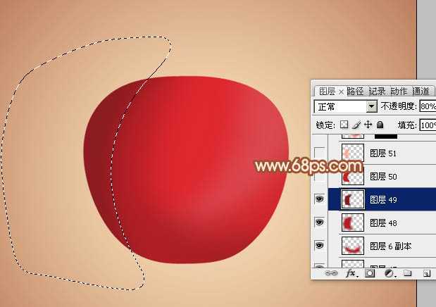 7、新建一个图层,用钢笔勾出左侧边缘部分的暗部选区,羽化15个像素后填充稍深的暗红色。