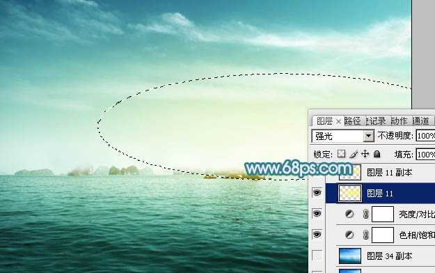 4、新建一个图层,用椭圆选框工具拉出下图所示的椭圆选区,羽化100个像素后填充淡黄色:#F9F178,混合模式改为“强光”,效果如下图。