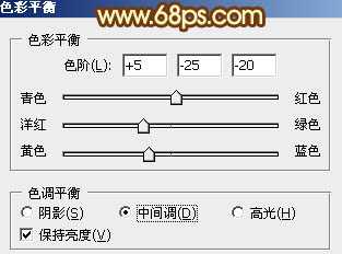 2、创建色彩平衡调整图层,对阴影、中间调、高光进行调整,参数设置如图4 - 6,效果如图7。这一步是给背景增加一些青蓝色。