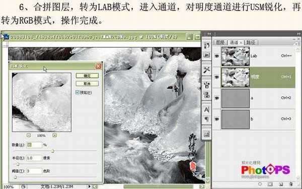 6、合拼图层,选择菜单:图像 > 模式 > Lab颜色,点通道面板,对明度通道进行USM锐化,参数设置如下图,再选择菜单:图像 > 模式 > RGB颜色,操作完成。