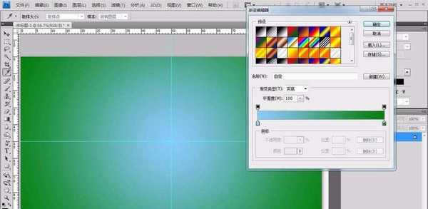 2、接着选择渐变工具,先给背景添加一个渐变色的效果,蓝色和绿色就是圣诞节的主题色,选择径向渐变,从中间向右下角拉出线即可。