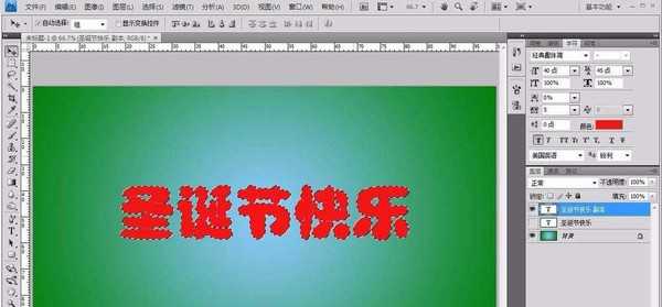 3、接下来就是创建文字图层,然后输入圣诞节快乐,当然文字内容也是随意的,然后设置颜色为红色。