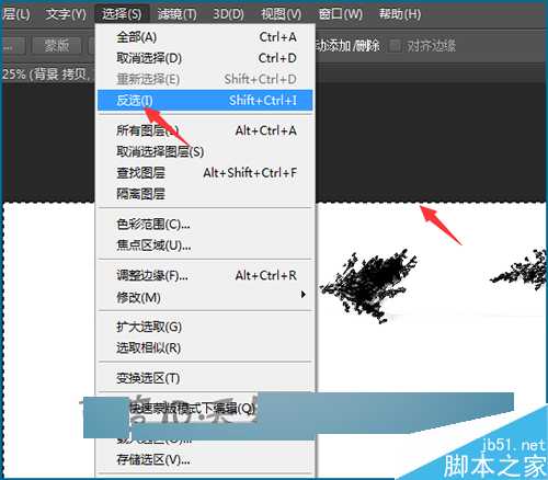 11、在选择菜单下面选择反选。点击之后,可以在素材上面看到之前选择中间部分的现在已经反选过来,只选中黑色的花。现在选中的花正是想要做出选区的部分。
