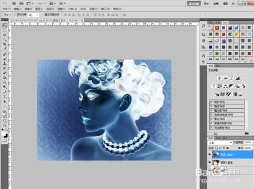 将图层中的副本,调整为强光模式,如图,但是效果在图中不明显,可以将涂层副本2前面的“眼睛”点掉,隐藏了图层副本2,这样强光效果就出来了。