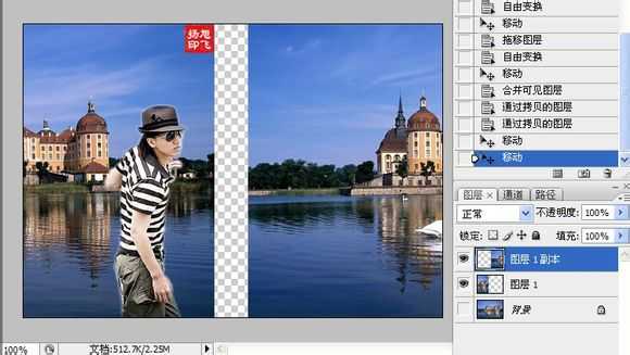 6、取消虚线框选择。左手按着Shift把图层1和图层1副本移回到接缝处,接着用左手按着Shift点蓝图层1和图层1副本,如上图所示;合并两个图层为图层1副本,如上图所示。