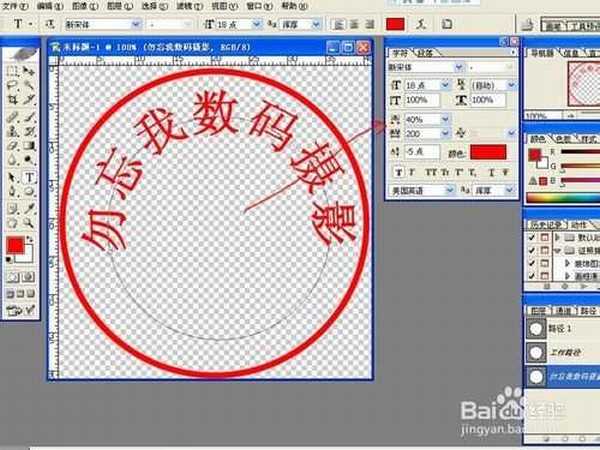 6、在路径1中选定路径,点工具栏中的“文字编辑工具T-横排”将光标放在选定的路径上单击一下,直接输入印章内容的文字,完后按住“ctrl”键,用鼠标调整文字大小 ,之后,点菜单“窗口--勾选字符”调出字符面板并设置好参数,把文字调整好,回到路径面板,删除路径1