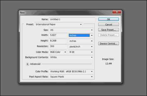 首先,我们来新建文件。这里我们需要设置长、宽还有分辨率。在我们的例子中,我打算使用A5的纸张大小,选择“国际标准纸张”,然后选择A5大小,分辨率则选择300DPI——为了打印出来的图片足够清晰。