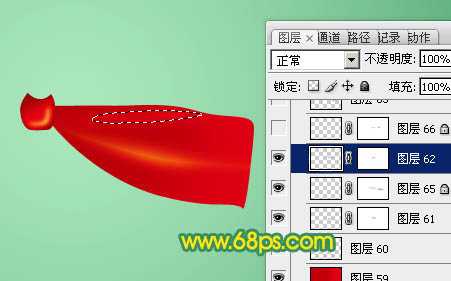 13、新建一个图层,用钢笔勾出下图所示的选区,羽化3个像素后填充红色。填色后不要取消选区,选择菜单:选择 > 修改 > 收缩,数值为7,确定后新建一个图层填充淡红色,效果如图15。