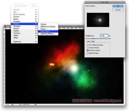 这次我们将在星层和星云层做上光晕效果,也许这个滤镜很简单很普通,但我觉得它仍然是个好滤镜,它会给你的创作带来好处。打开滤镜 > 渲染 > 镜头光晕,亮度设为100%,镜头选35毫米和100毫米,比如星云层用35毫米,星星层用100毫米,这里你可以根据你的实际情况作选择,好看就行。
