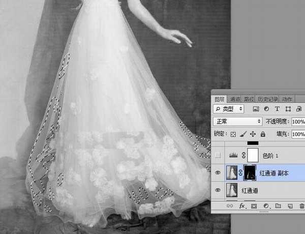 本文抠出分为两个部分。首先是婚纱裙子部分,这一部分相对要难一点,因为裙子边缘及底部区域都是半透明的,通道中处理的时候不能调得过亮;然后是头发部分,颜色比较暗,比较容易抠出。