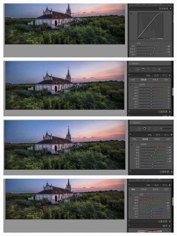 图片整体调亮后,整个片子会有点发灰,这个时候调整曲线和颜色来改善。曲线高光部分很少,所以加了很多高光,这样整个明暗对比就出来了,颜色部分由于是黄昏所以在色相里面把绿色往左偏,显的绿植稍微黄一点点,更加凸显气氛。