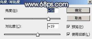 8、创建亮度/对比度调整图层,大幅增加亮度及对比度,参数设置如图17,确定后创建剪切蒙版;再把蒙版填充黑色,用透明度较低柔边白色画笔把图18所示的区域擦出来。这一步增加暗部局部亮度。