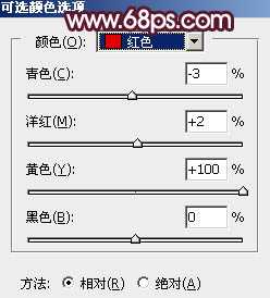 2、创建可选颜色调整图层,对红色,黄色进行调整,参数设置如图5,6,效果如图7。这一步把草地颜色转为橙红色。