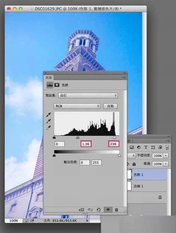 再新增一個色階調整圖層,分別將亮面與中間調的控制點向左拉。