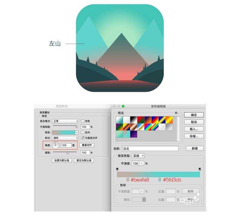 7、添加图层样式,左侧山的 “渐变叠加”