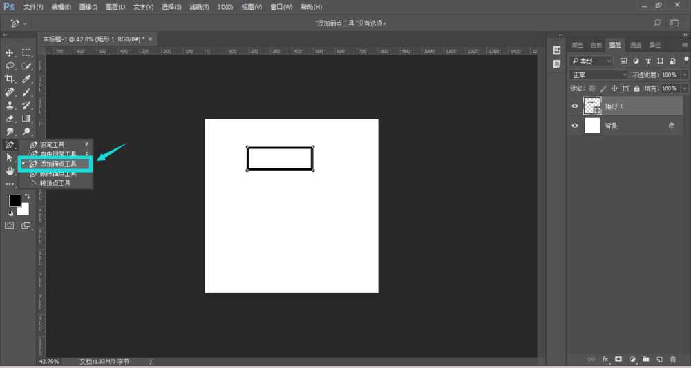 3、在矩形右侧中心位置添加一个锚点,如图,如果锚点有抓手,可以选择工具中的转换点工具,在锚点处点击,将抓手线去掉