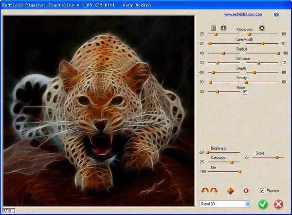 03.模式选择Glow100,通过其它参数调节出合适的样子;调节的时候插件会需要一定时间运算,速度会延时一定时间取决于图片素材大小及电脑配置;效果满意后确定