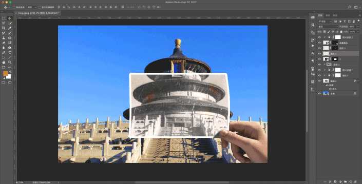 2. 置入手拿照片的素材,并把此素材隐藏,将天坛的部分用选取工具圈出来复制「ctrl+j」以做旧照片效果。
