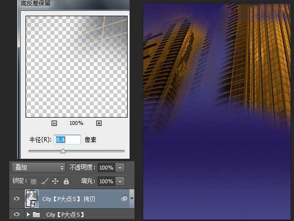 选择住城市图层,色相/饱和度调整层以及色阶调整层,CTRL+G创建图层组,并复制一层图层组,合并组,执行一个高反差保留滤镜,参数如下,并将图层混合模式更改为叠加。