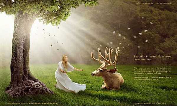 PS合成大树下唯美的美女和鹿王嬉戏场景