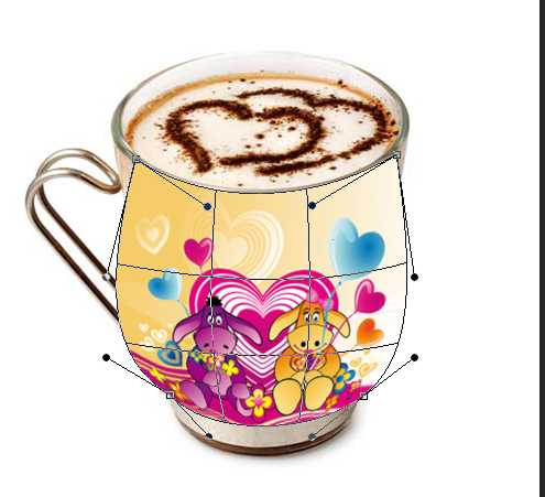 一、使用“移动工具”将卡通图像拖到咖啡文档中。按下“ctrl+t”快捷键显示定界框,在图像上单击右键,在打开的快捷菜单中选择“变形”命令,如图1所示,显示变形网格,如图2。