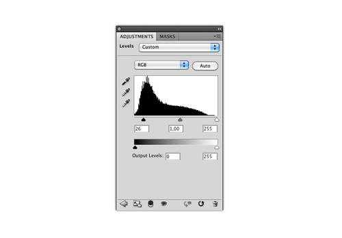四、再次打开调整菜单,选择色阶,按下面图片将数值分别设为 26 / 1,00 / 255 , 现在纹理的效果就是我们想要的了。
