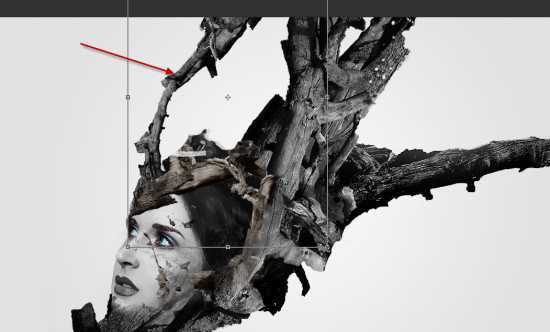 这一步开始添加树枝。在树木层选择一根比较粗壮的树枝,并将其粘贴到我们的文档。使用自由变换工具来调整大小,并将其旋转到如下图所示: