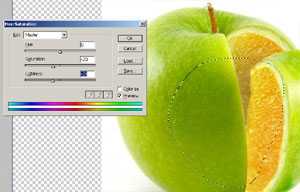 九、使用套索工具建立选区,使用色相/饱和度工具使白色果皮边缘部分更接近绿色,然图像更自然。