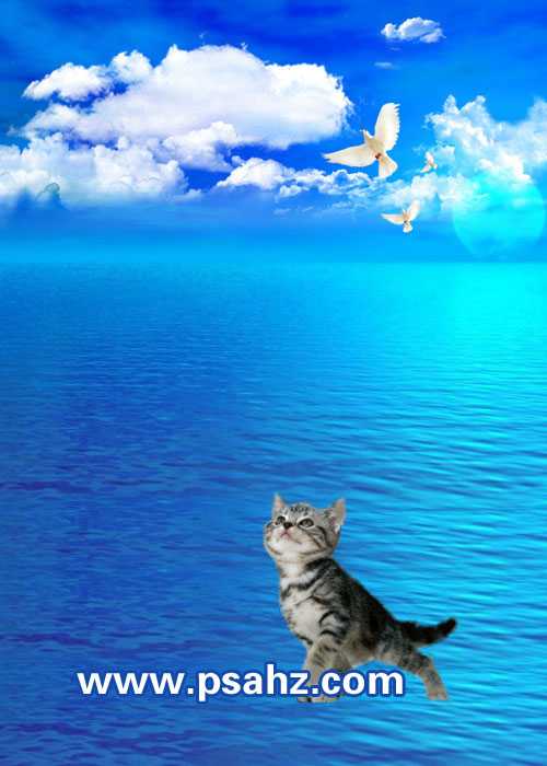 1、新建画布,大小设置宽为“500像素”,高为“700像素”,分辨率为72像素/英寸,模式RGB,将素材背景拖入画布,ctrl+t缩放到合适位置,用选区工具圈住海洋,ctrl+j将海洋部分复制。用橡皮擦工具,硬度为“0”,设置好合适大小将海洋的多个复制层擦出如图效果,使海洋看起来真实自然。合并图层,如图: