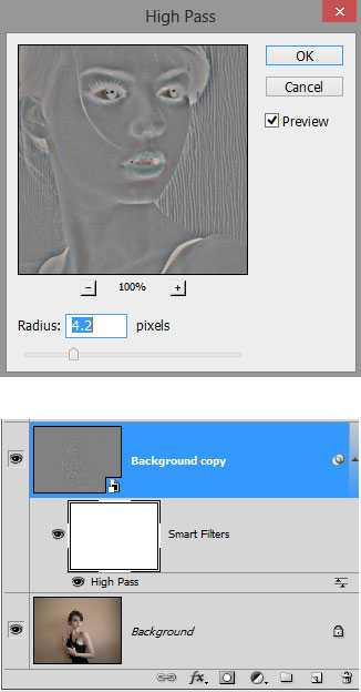 最后,按Ctrl + Alt + Shift + E合并所有层。 这一层转换为智能对象层,并添加高反差滤镜。 设置为叠加模式100%的不透明度。
