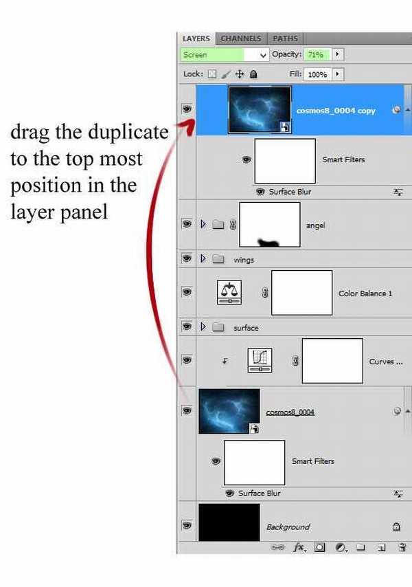选择宇宙层复制一次。 宇宙复制移动到最顶端位置在图层面板中。 设置滤色模式,71%的不透明度。
